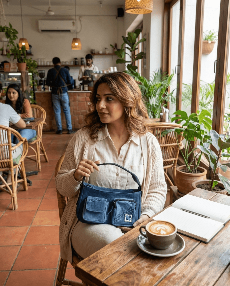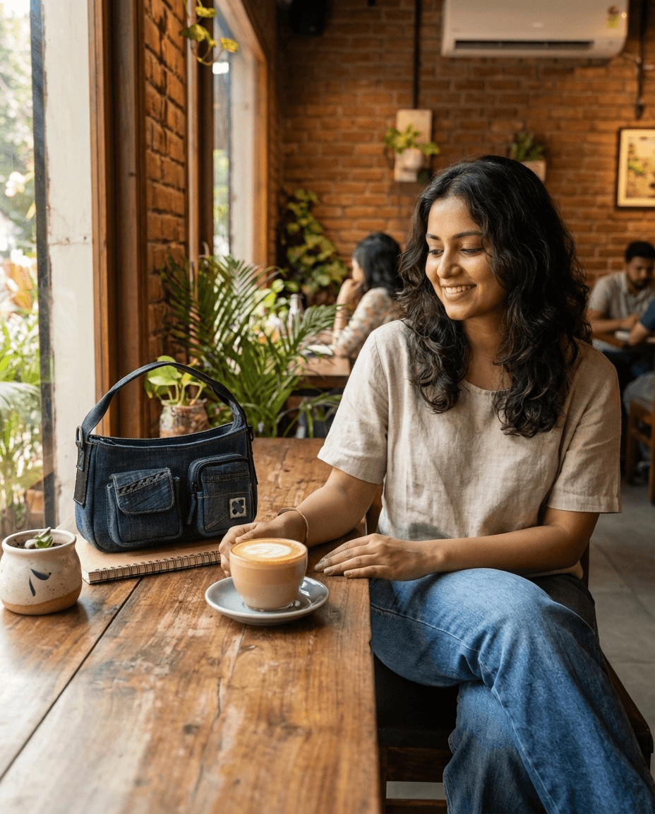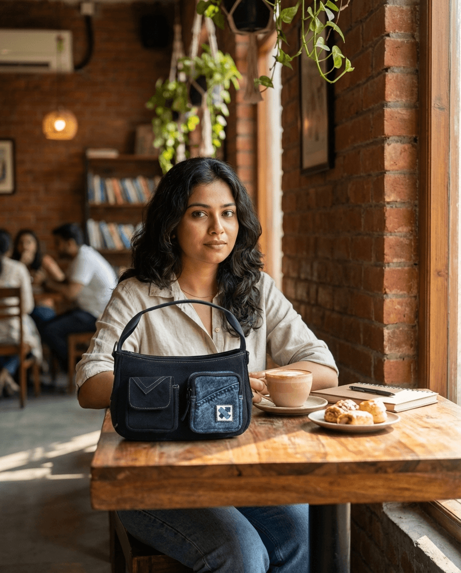 • Primary body fabric - Upcycled denim (cut and sorted), sourced from a recycling unit.