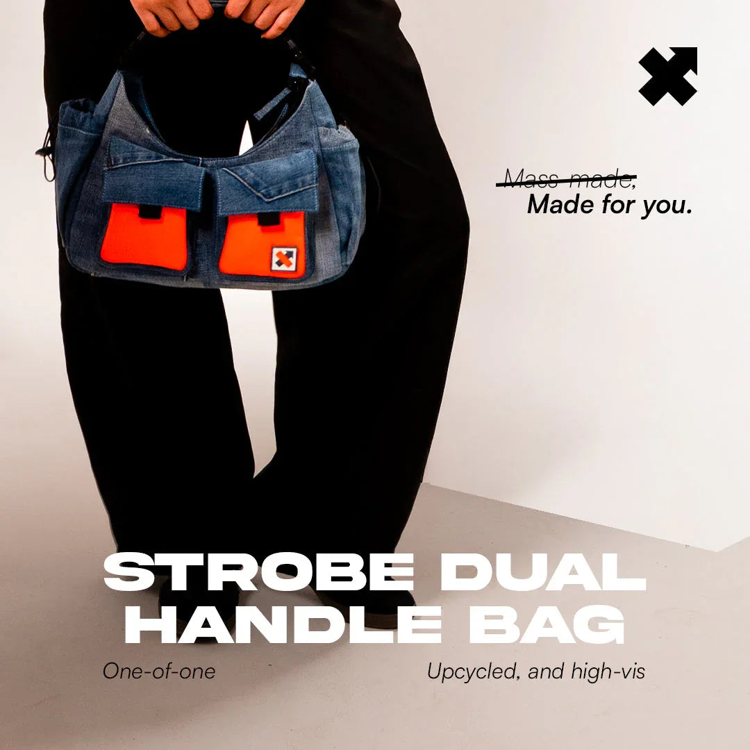 Meet the Strobe Dual Handle Bag - upcycled from pre-loved denim and industry surplus of utility workwear. With twin front and scrunched side pockets, it keeps essentials handy. Carry it as a shoulder bag or switch to the crossbody belt for a laid-back look.