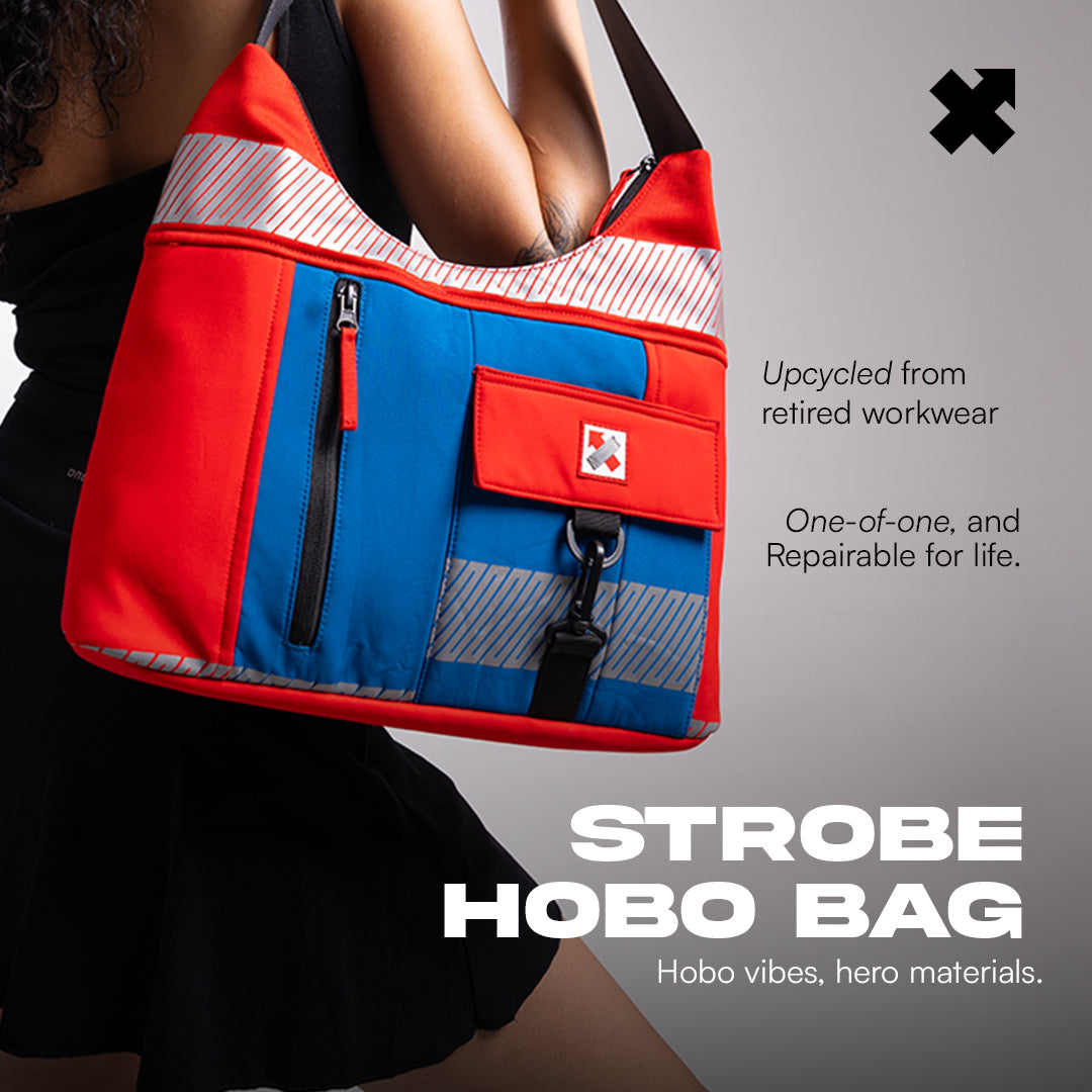 Meet the Strobe Hobo Bag – upcycled from utility workwear jackets. A slouchy silhouette with a bold front and an adjustable strap, it balances effortless style with everyday function.