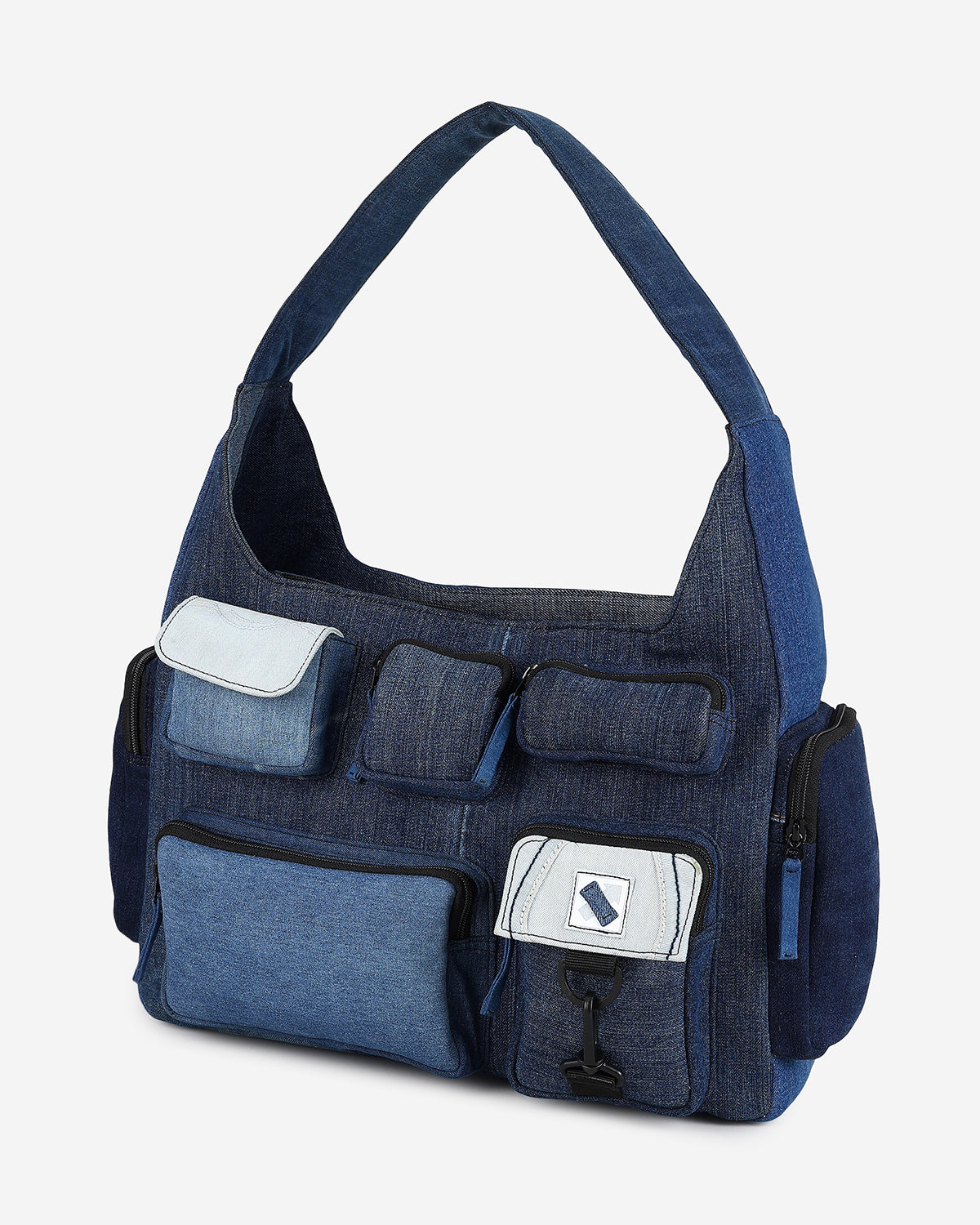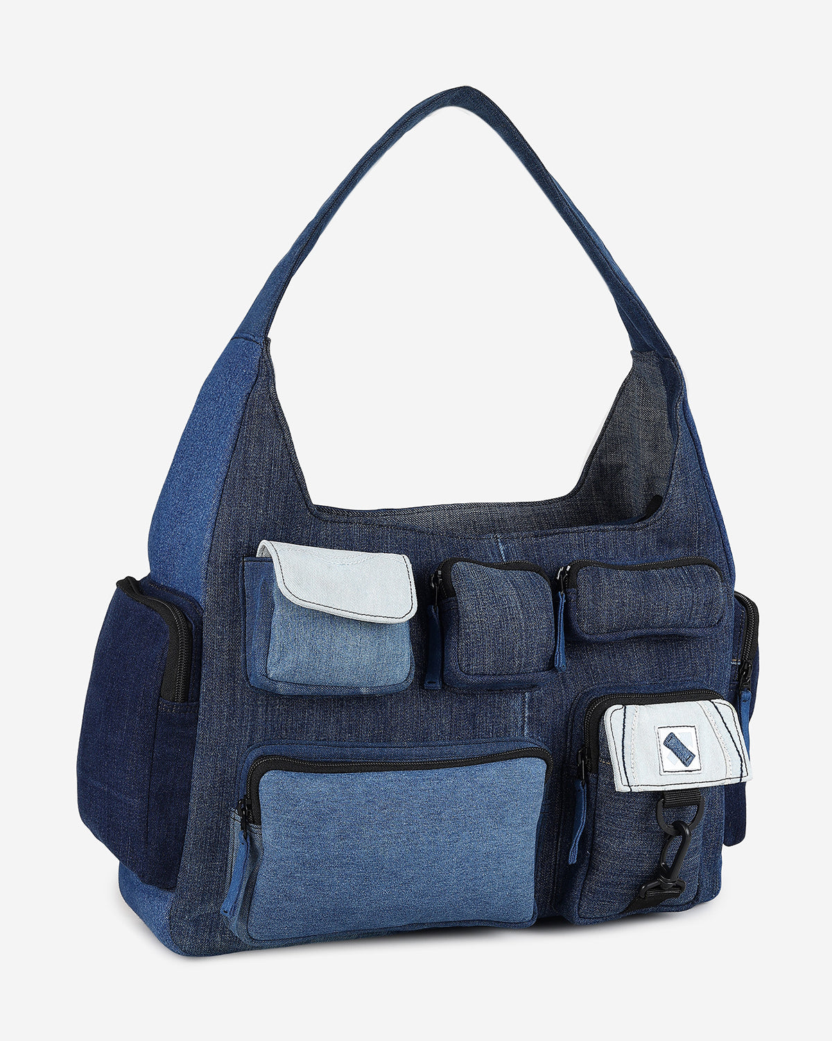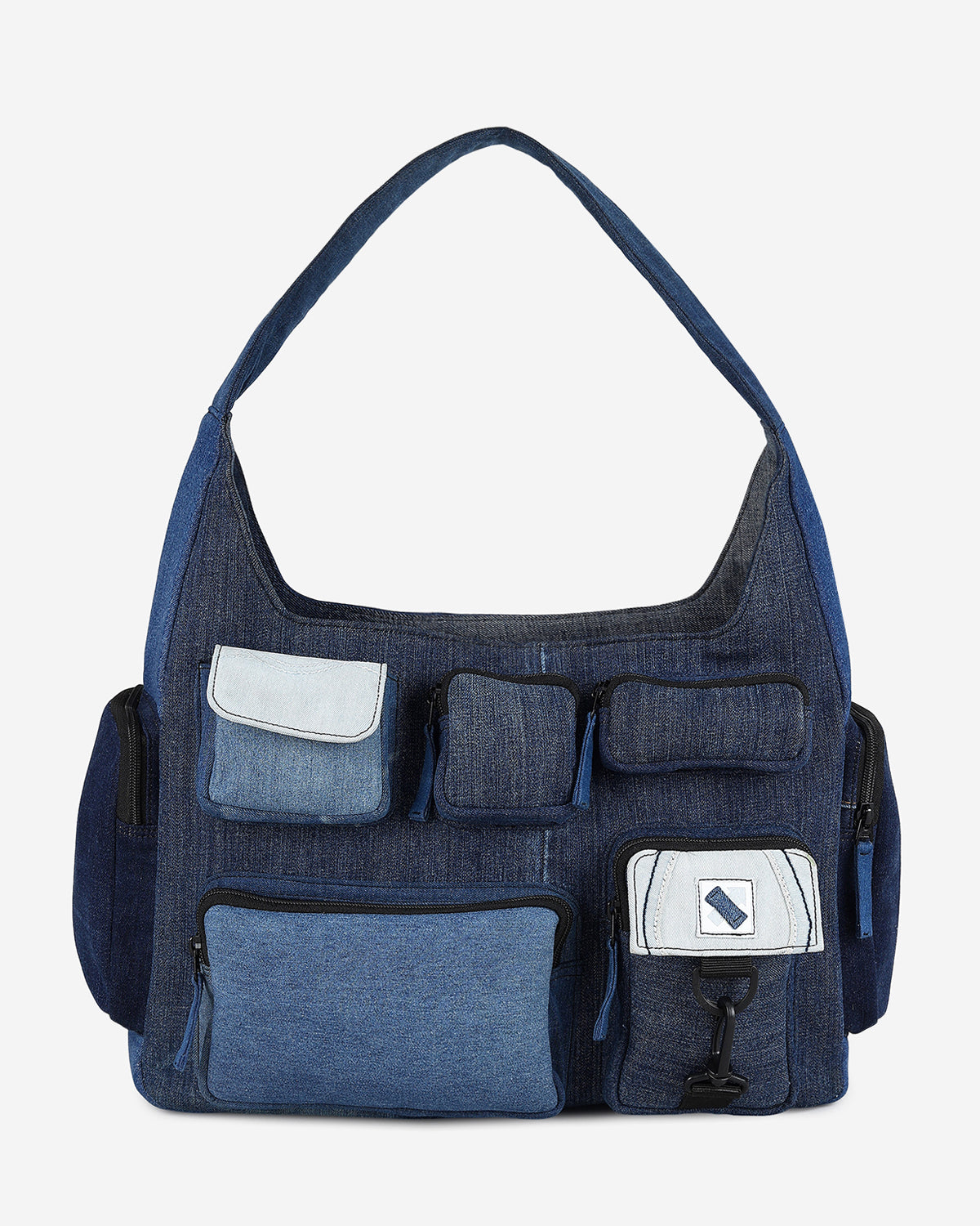 POCKET CLUSTER HOBO BAG - Multi Blue Denim Mix